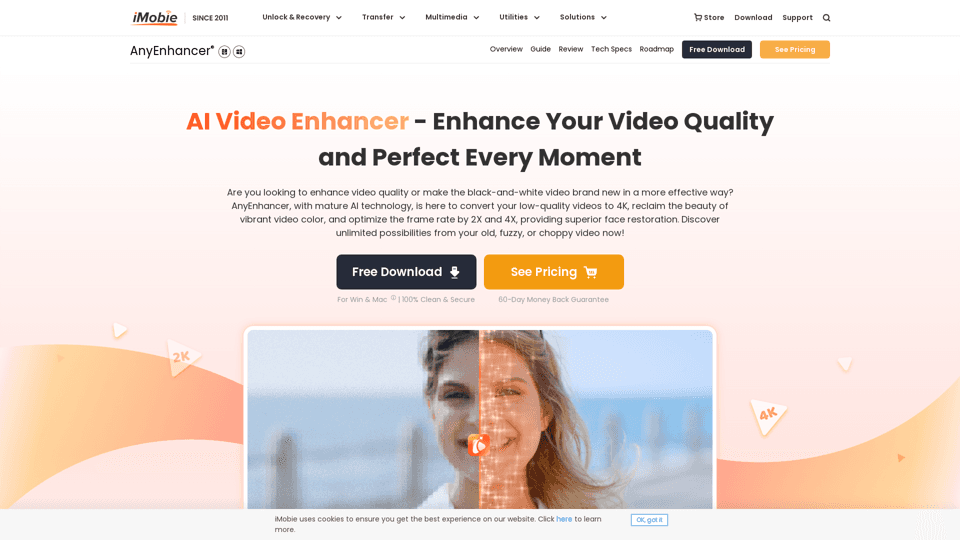 Upscales low-resolution videos to 4K by sharpening blurry frames and adding details to the footage.