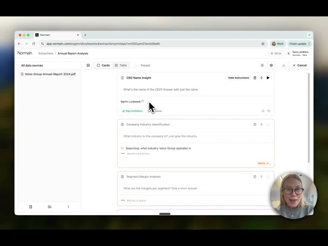 Built for professional services firms, Normain serves governance, risk, audit, compliance, due diligence, M&A, tax, and sustainability teams. The vendor claims 99% accuracy and 50-80% time savings (methodology not publicly disclosed), making it a powerful AI data analysis tool for organizations that need reliable document intelligence at scale.